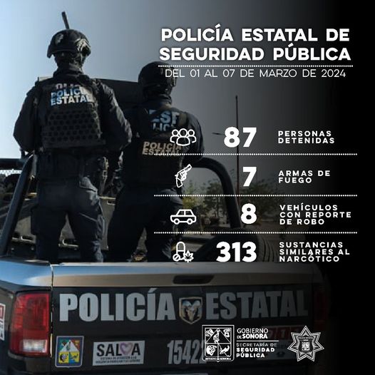 Hermosillo.- En operativos de atención a la denuncia ciudadana y prevención del delito, la Policía Estatal de Seguridad Pública (PESP), realizó la detención de 87 personas, además de la incautación de sustancias prohibidas.
