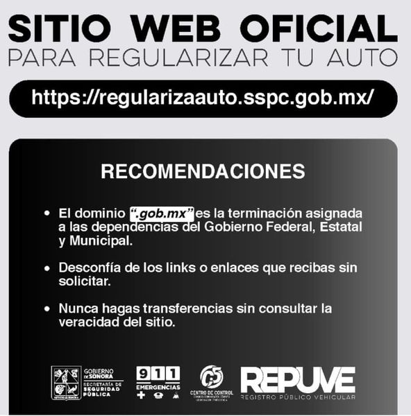 Hermosillo.- Para realizar el trámite de la regularización de autos usados de procedencia extranjera, la ciudadanía debe acceder únicamente al sitio web https://regularizaauto.sspc.gob.mx, y evitar ingresar a cualquier otro enlace que se reciba sin solicitud, informó personal del Registro Público Vehicular (Repuve) en Sonora.