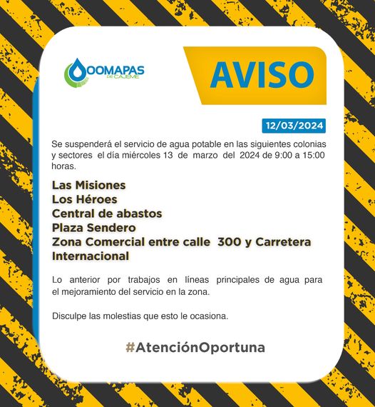 Se suspenderá el servicio de agua potable en las siguientes colonias y sectores: