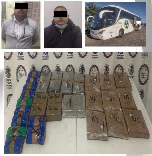 En atención a una denuncia ciudadana, elementos de la Policía Federal Ministerial (PFM), detuvieron a Francisco “N” y a Abraham “N”, quienes iban a bordo de un vehículo tipo autobús de pasajeros, de la marca Marcopolo, al encontrar en el techo del camarote, nueve paquetes con la leyenda N1, conteniendo tabletas de fentanil; cinco paquetes con la leyenda “HOUSE, “MASERATI” y “manzana”, con una sustancia compacta de color blanco y 15 paquetes con la leyenda “trébol” y “X”, conteniendo heroína.