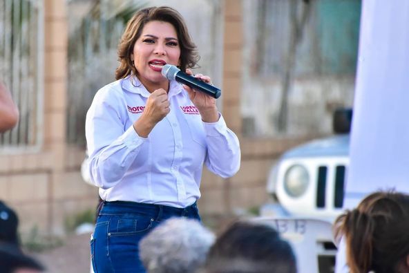 Con ella, estuvieron en el mítin su compañero de fórmula Heriberto Aguilar Castillo y la candidata a la diputación federal por el distrito 7, Alma Higuera Esquer.