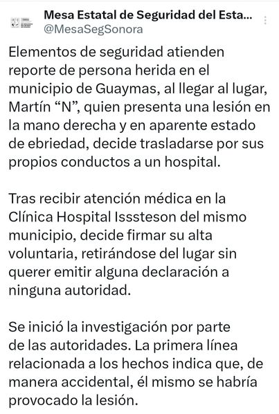 La Mesa Estatal de Seguridad Pública emitió un comunicado relacionado con el regidor de Guaymas, Martín Ríos Quintero, quien fue atendido en un hospital por una lesión de balazo en la mano.