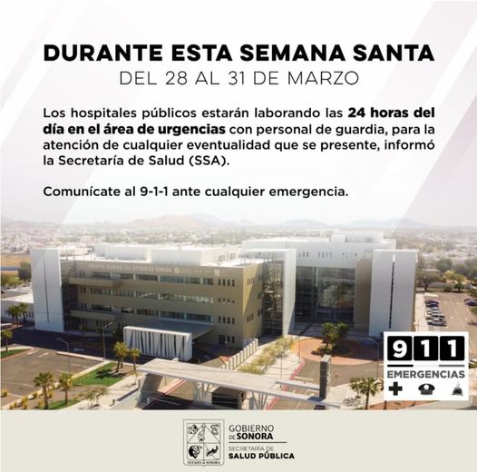Hermosillo.- Durante esta Semana Santa, del 28 al 31 de marzo, los hospitales públicos estarán laborando las 24 horas del día en el área de urgencias con personal de guardia, para la atención de cualquier eventualidad que se presente, informó la Secretaría de Salud (SSA).