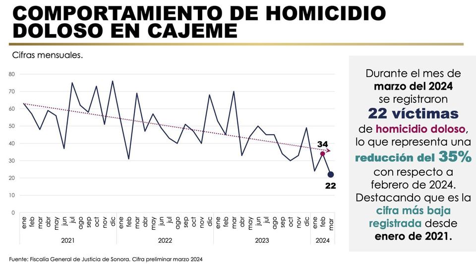 Cajeme- Al cierre del mes de marzo el municipio de Cajeme registró una disminución en el delito de homicidio doloso del 35% con respecto a febrero de este año, al pasar de 34 a 22 víctimas, de acuerdo al registro de la Fiscalía General de Justicia del Estado de Sonora (FGJES).