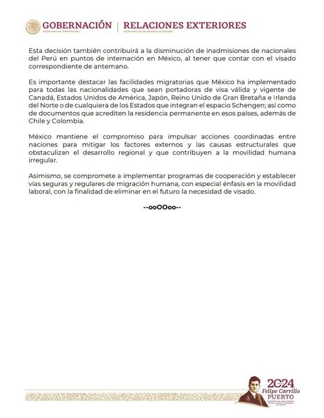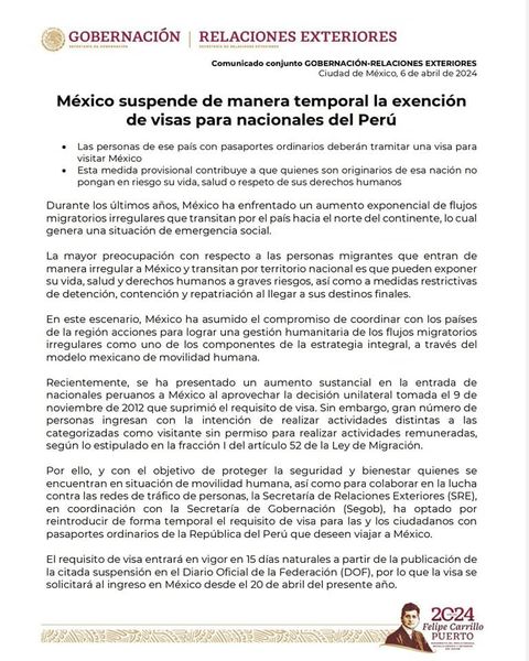 #GobernaciónInforma | MÉXICO SUSPENDE DE MANERA TEMPORAL LA EXENCIÓN DE VISAS PARA NACIONALES DEL PERÚ