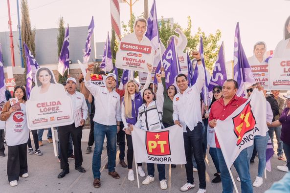 Un miércoles con una agenda muy movida tuvieron la fórmula de la 4T por el PT, Celida López y Froylán Gámez en Agua Prieta primero con medios de la región fronteriza y después una movida pega de calcas en la calle 13.