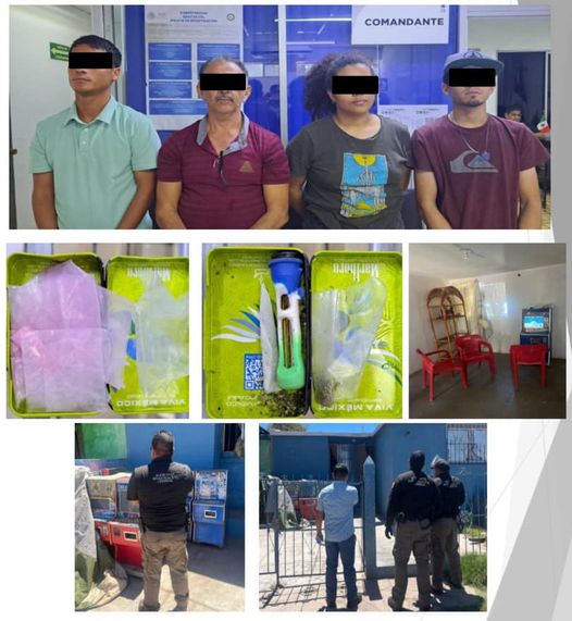 Autoridades que integran la Mesa Estatal de Seguridad, en coordinación con los tres niveles de gobierno, efectuaron la detención de cuatro personas con diversos tipos de droga y máquinas “tragamonedas” en el municipio de Guaymas.