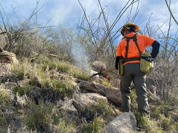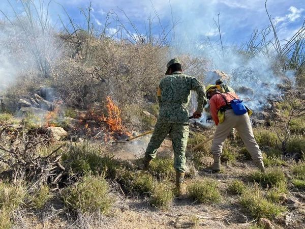 Integrantes de la Brigada Estatal de Manejo de Fuego de Sagarhpa y Protección Civil Sonora, trabajando junto con personal de la Secretaría de la Defensa Nacional y la Policía Estatal de Seguridad Pública, lograron liquidar el incendio forestal que se presentó en el Rancho El 4 en el municipio de Trincheras.