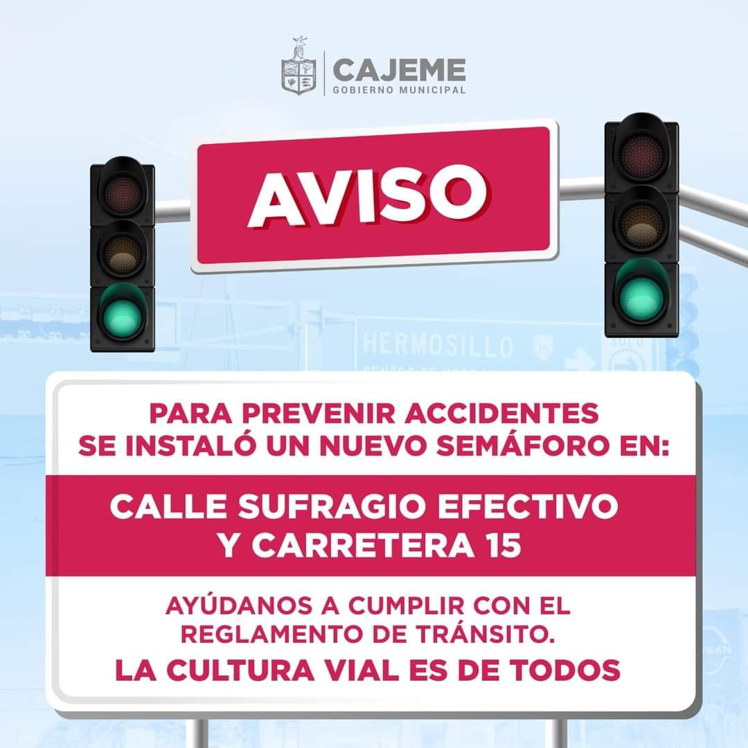 Amiga y amigo conductor el Gobierno Municipal de #Cajeme a través de la SSPM, te informa que ya se encuentra puesto en ⁷marcha el semáforo del crucero situado en la Sufragio Efectivo y Carretera 15, respeta las indicaciones de los señalamientos y unidos podremos prevenir