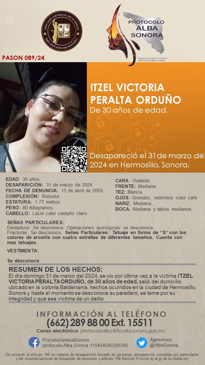 Se solicita a la ciudadanía su colaboración en la difusión de la cédula de Protocolo Alba para la búsqueda y pronta localización de ITZEL VICTORIA ORDUÑO PERALTA, de 30 años de edad. Desapareció el 31 de Marzo de 2024, en Hermosillo, Sonora.Muchas gracias de antemano por su valioso Apoyo.