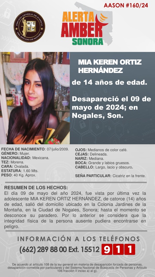 SE ACTIVA ALERTA AMBER SONORA PARA BÚSQUEDA y LOCALIZACIÓN DE MIA KEREN ORTIZ HERNÁNDEZ, de 14 años de edad, Desapareció el 09 de mayo de 2024, en Nogales, Sonora*