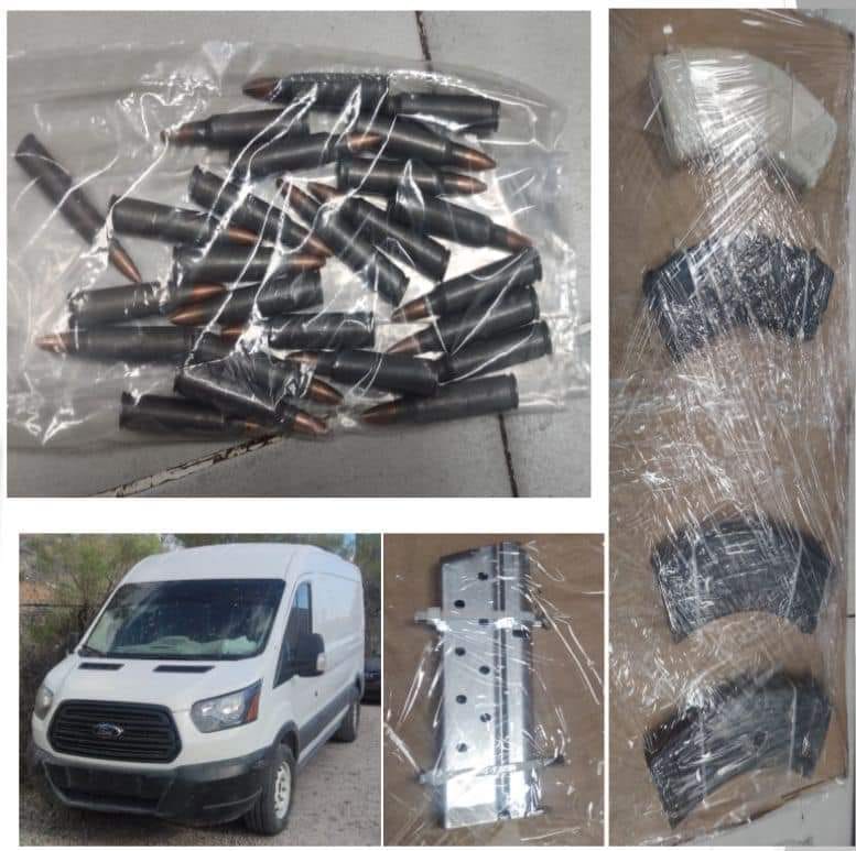 Elementos de la Secretaría de la Defensa Nacional (Sedena) y de la Guardia Nacional informaron que, en trabajos de coordinación, se aseguró un vehículo tipo vagoneta marca Ford, línea Transit, color blanco, modelo 2019, con reporte de robo en Estados Unidos, y en su interior se encontraron cinco cargadores para arma de fuego de uso exclusivo y 25 cartuchos calibre .223 mm.