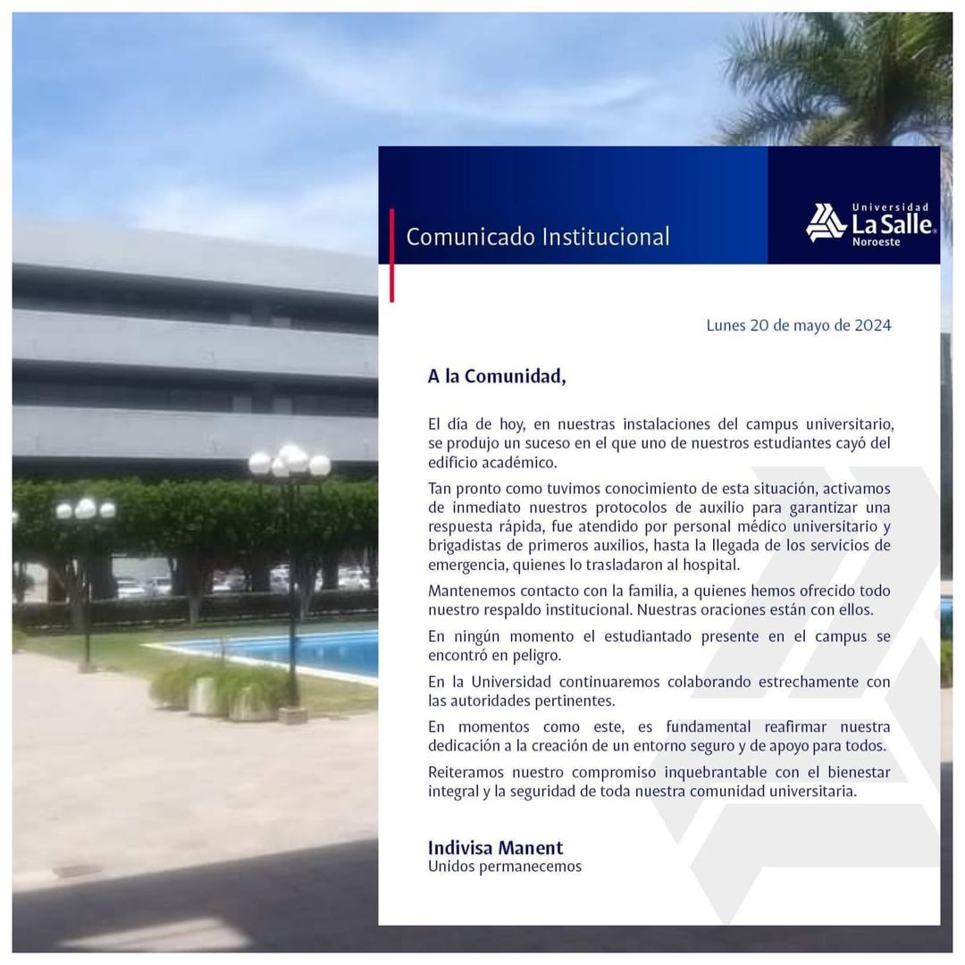 CAE ALUMNO DE LA #ULSA NOROESTE DEL TERCER PISO; UNIVERSIDAD EMITE COMUNICADO