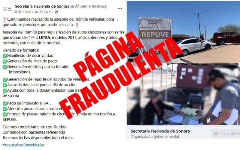 Hermosillo, Sonora.- Mediante labores de ciberpatrullaje se detectó en la red social Facebook la presencia de fan page fraudulenta que ofrece a la ciudadanía realizar el trámite correspondiente para la regularización de vehículos usados de procedencia extranjera, advirtió la Secretaría de Seguridad Pública (SSP) de Sonora.