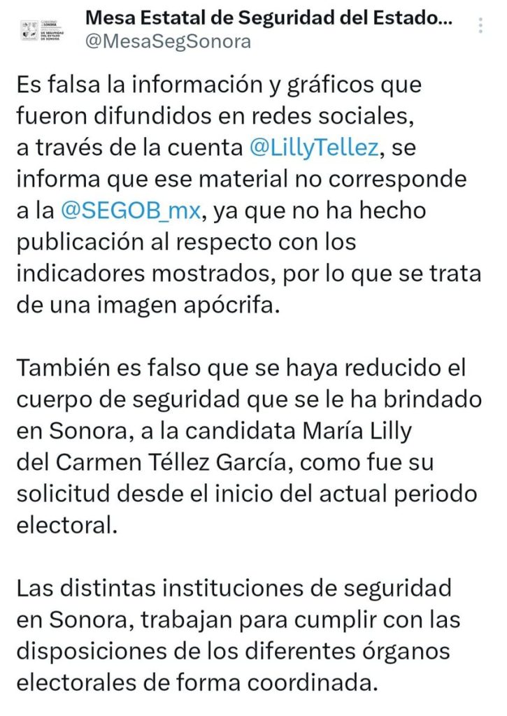 – Lo de la candidata Lilly Téllez ya se torna en lo ridículo, hacer una imagen falsa de Gobernación para señalar índices imaginarios es absurdo