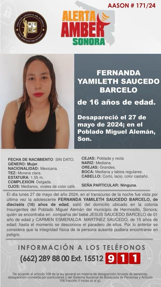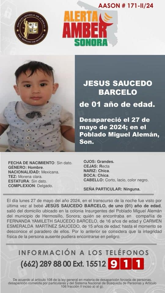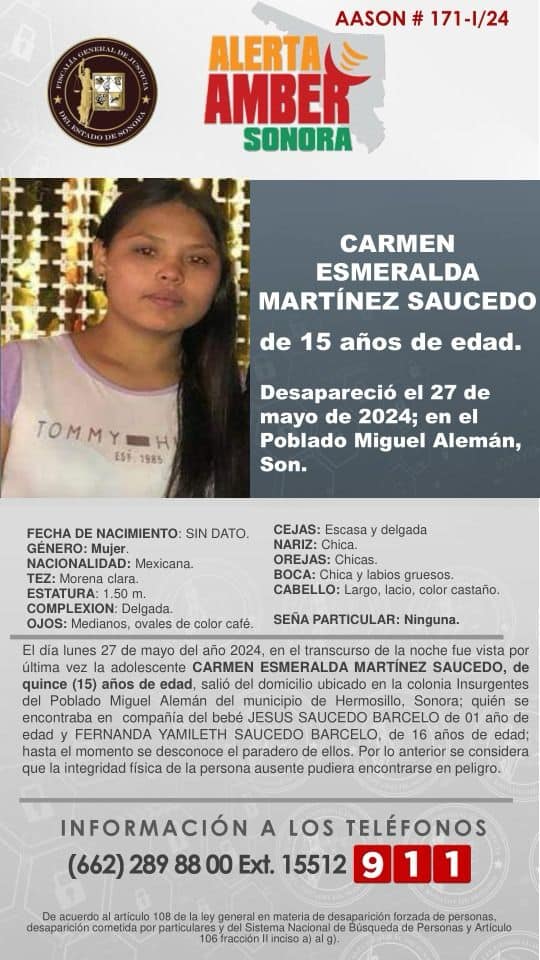 Se trata de JESÚS SAUCEDO BARCELÓ, de 01 año de edad; FERNANDA YAMILETH SAUCEDO BARCELÓ y CARMEN ESMERALDA MARTÍNEZ SAUCEDO, de 16 y 15 años de edad respectivamente, Desaparecieron el 27 de mayo de 2024, en el Poblado Miguel Alemán, Sonora