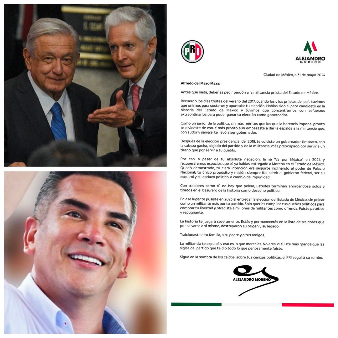 “La historia te juzgará severamente, Alfredo Del Mazo. Estás y permanecerás en la lista de traidores que por salvarse a sí mismo, destruyeron su origen y su legado”, expresó Alejandro Moreno, dirigente nacional del PRI, sobre el exgobernador del Estado de México.
