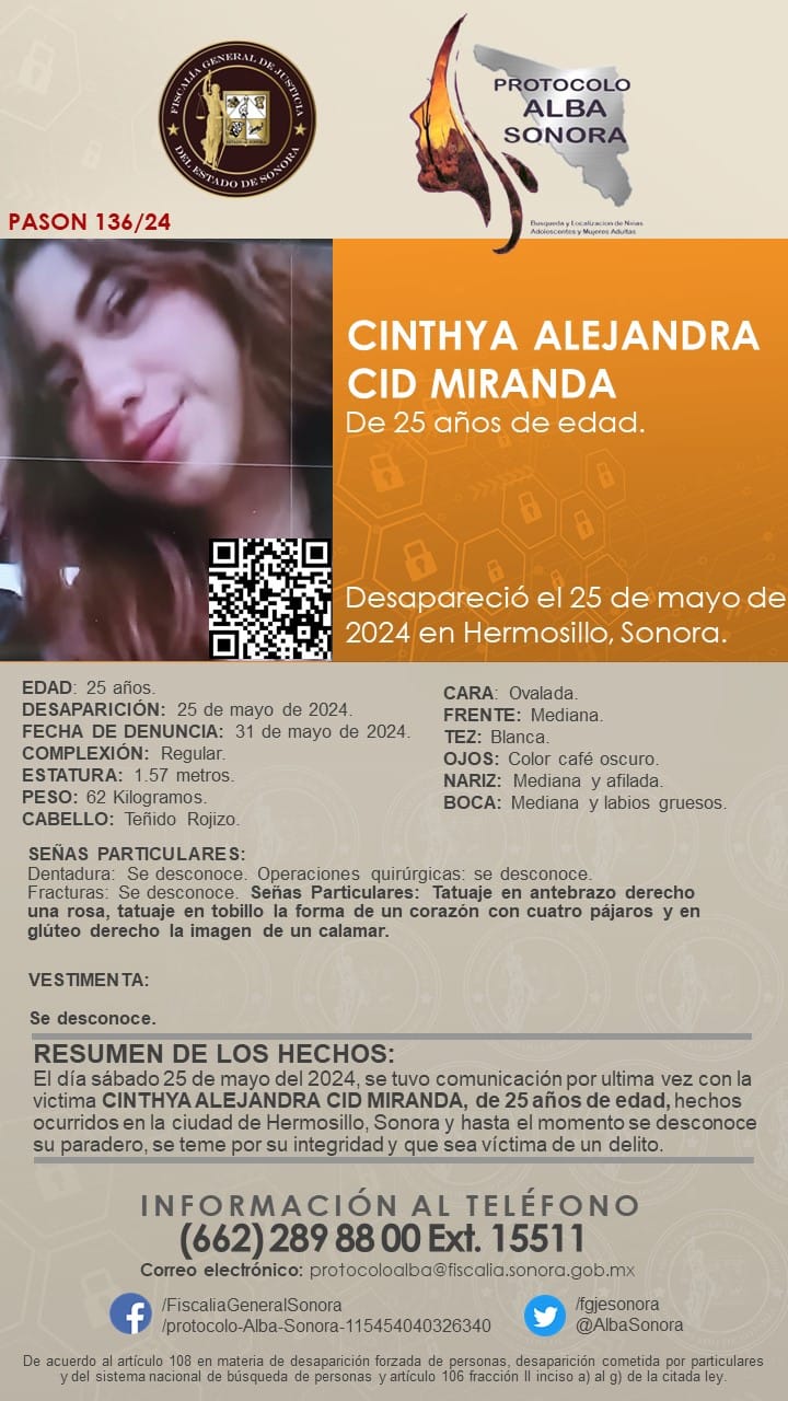 Se solicita a la ciudadanía su colaboración en la difusión de la cédula de Protocolo Alba para la búsqueda y pronta localización de *CINTHYA ALEJANDRA CID MIRANDA*, de 25 años de edad. Desapareció el 25 de mayo de 2024, en Hermosillo, Sonora.