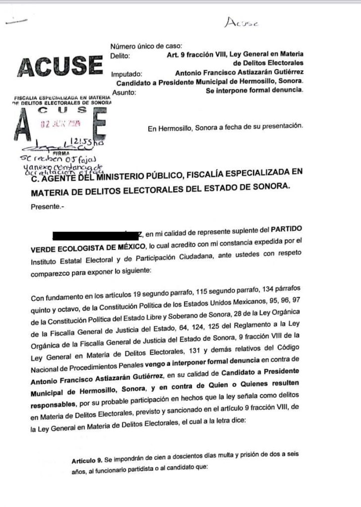 Cada ciudadano debe tener la confianza de que su voto será respetado y que las elecciones se llevarán a cabo de manera justa y transparente. Hemos presentado una denuncia formal ante la Fiscalía Especializada en Materia de Delitos Electorales en Sonora contra el candidato del PRI, Antonio Francisco Astiazarán Gutiérrez, por su participación en hechos que la autoridad señala como delitos electorales.