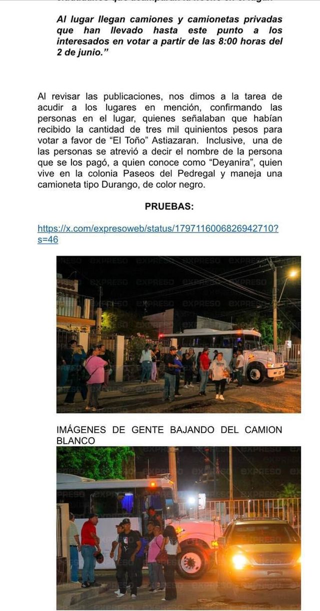 Esta denuncia se refiere a actos de acarreo y pago por votos que hemos identificado durante esta noche en casillas especiales que se han colocado en Hermosillo. Estas prácticas ilegales no solo son un atentado contra la democracia, sino que también socavan la confianza pública en nuestras instituciones. No podemos permitir que estos actos queden impunes. Exigimos a las autoridades competentes que investiguen a fondo estos señalamientos y que tomen las medidas necesarias para garantizar un proceso electoral limpio y justo.