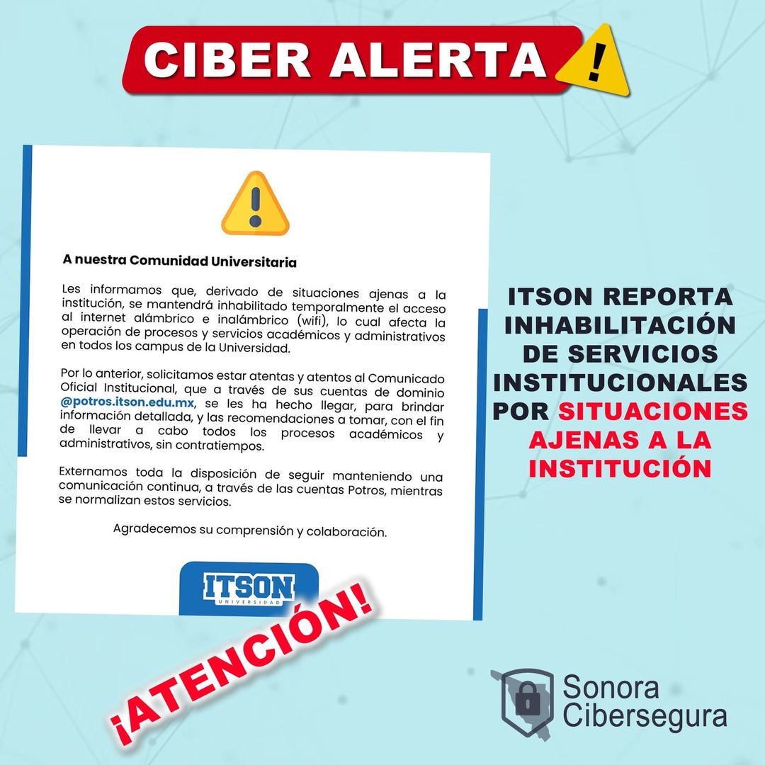 El ITSON reporta la inhabilitación de varios servicios institucionales en su infraestructura tecnológica en todos sus campus, debido a “situaciones ajenas a la institución”. Usuarios reportan que la universidad ha sido víctima de un ciberataque grave.