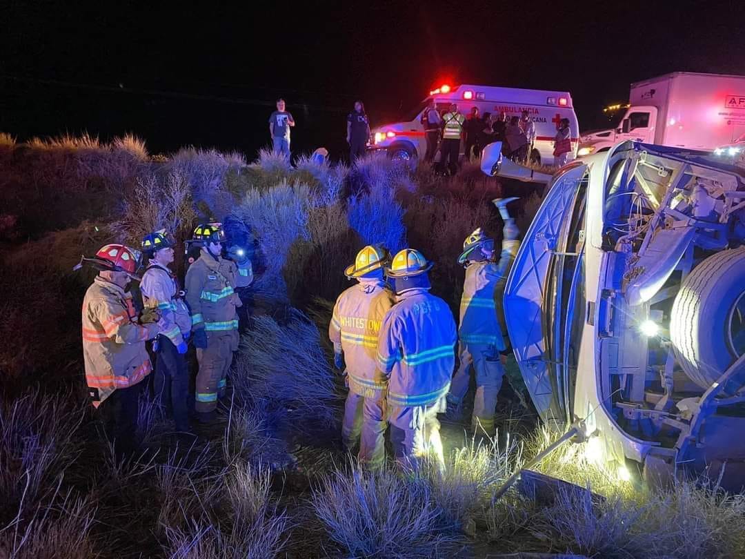 Santa Ana, Sonora – Un autobús de pasajeros de la línea Elite con número económico #10119 volcó esta madrugada en el kilómetro 5 de la carretera Santa Ana-Altar, dejando un saldo de 15 personas lesionadas, una de ellas con un brazo aplastado por el vehículo.