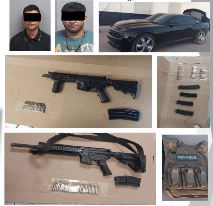 Las personas arrestadas fueron identificadas como Marcos “N” y Ángel Guadalupe “N”, quienes ocupaban un vehículo de dos puertas sin placas de circulación, en el que portaban dos armas de fuego tipo fusil, seis cargadores para arma de fuego, 135 cartuchos calibre.223 y un chaleco color arena con la leyenda “Marina” con dos placas.