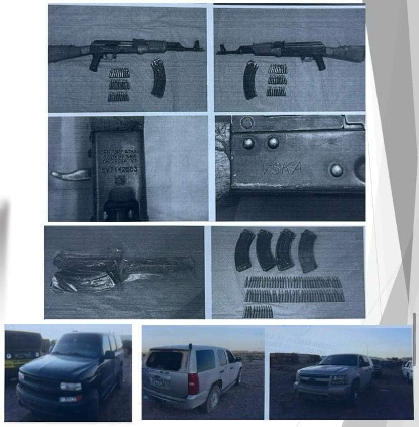 En ese mismo municipio la FGJS, informó sobre el aseguramiento de un arma de fuego tipo fusil, calibre 7.62 x 39 mm; cinco cargadores para arma de fuego calibre 7.62 x 39 mm; 120 cartuchos útiles calibre 7.62 x 39 mm; un vehículo tipo camioneta, marca Chevrolet, modelo 2007, con placas de Arizona, Estados Unidos; un vehículo tipo camioneta, modelo 2003, sin placas de circulación.
