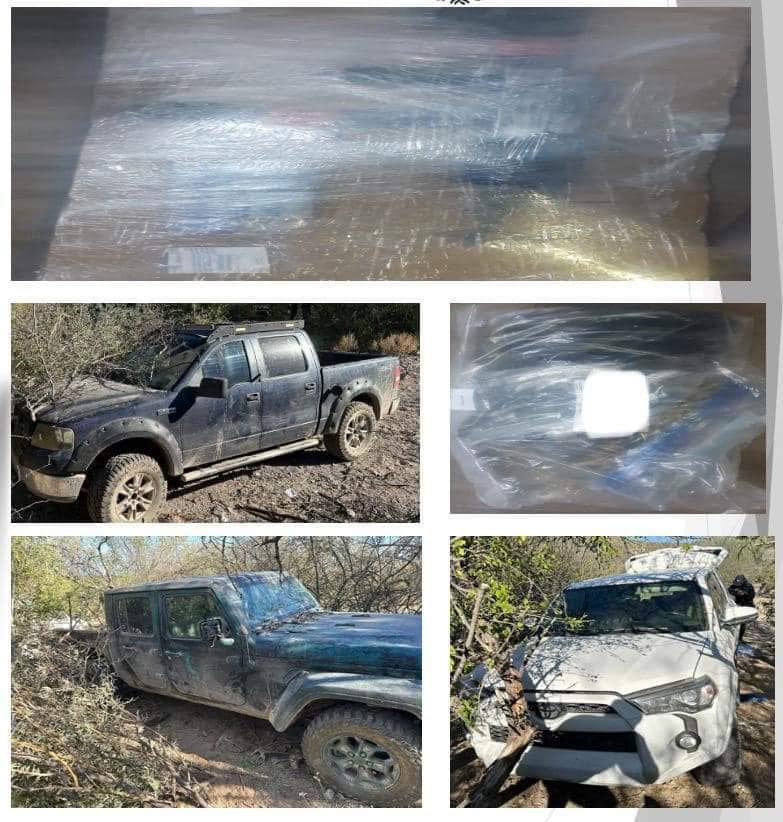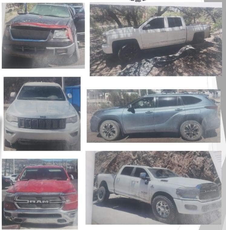 Personal de la Fiscalía General de Justicia del Estado de Sonora (FGJS), en las inmediaciones del rancho Botellas logró el aseguramiento de seis vehículos: un vehículo blindado de la marca RAM, modelo 2023 con placas de Arizona, Estados Unidos; un vehículo de la marca Ford, modelo 2006, sin placas de circulación; un vehículo de la marca Jeep, modelo 2018 con reporte de robo en Estados Unidos.