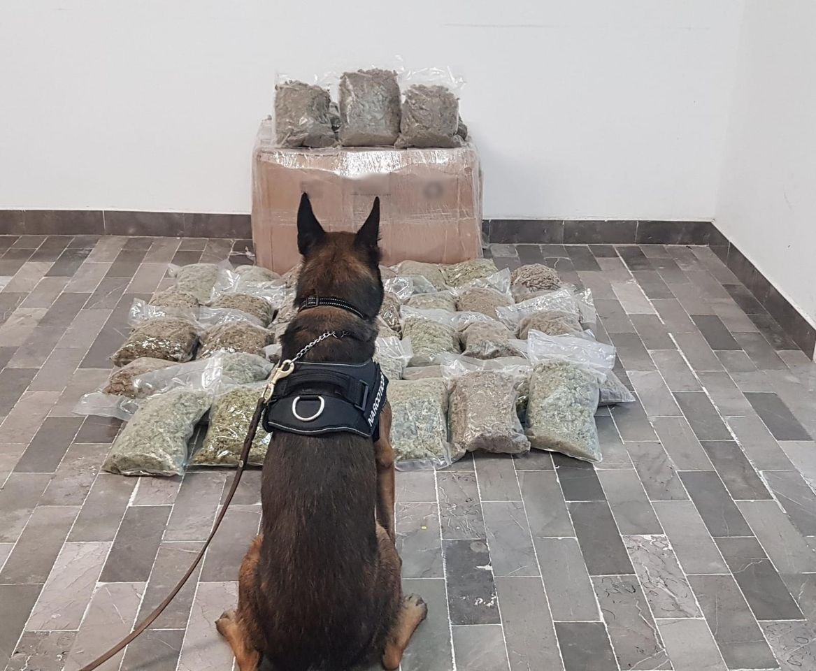 El personal de la Guardia Nacional inspeccionó la caja de cartón y localizó 40 paquetes de plástico cerrados al alto vacío, que contenían hierba verde y seca con las características propias de la marihuana.