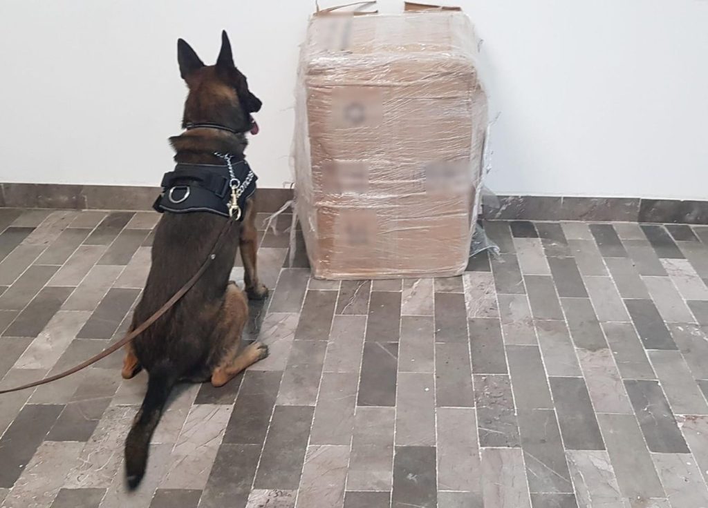 Tras olfatear los envíos, el ejemplar canino se interesó por una caja de cartón procedente de Tepic, Nayarit, ante la cual mostró una señal positiva por la posible presencia de algún objeto o sustancia ilícita.