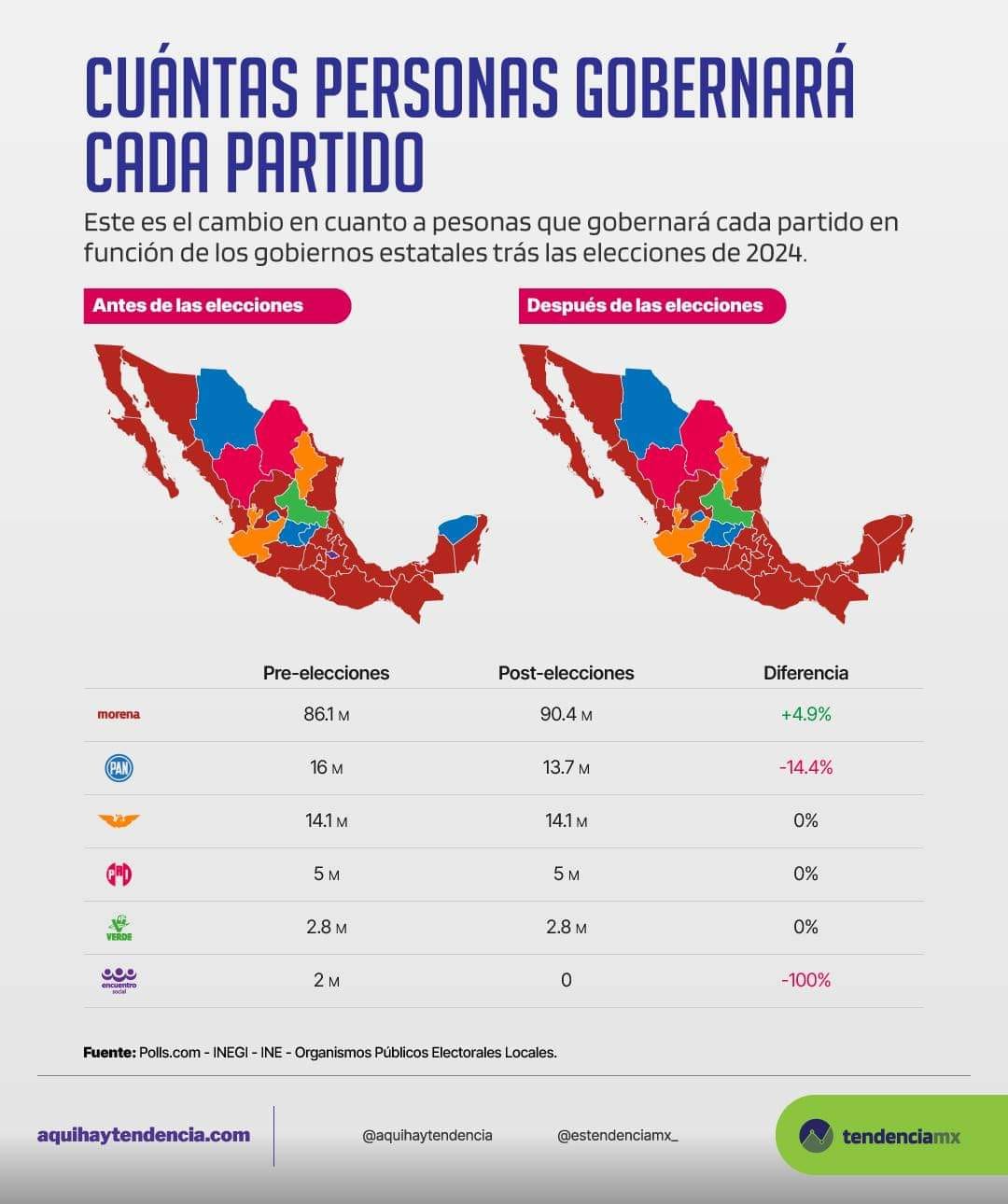 Tras las elecciones de 2024 a la gubernatura en distintos estado, así es como ha cambiado los números sobre la cantidad de personas que gobierna cada partido.