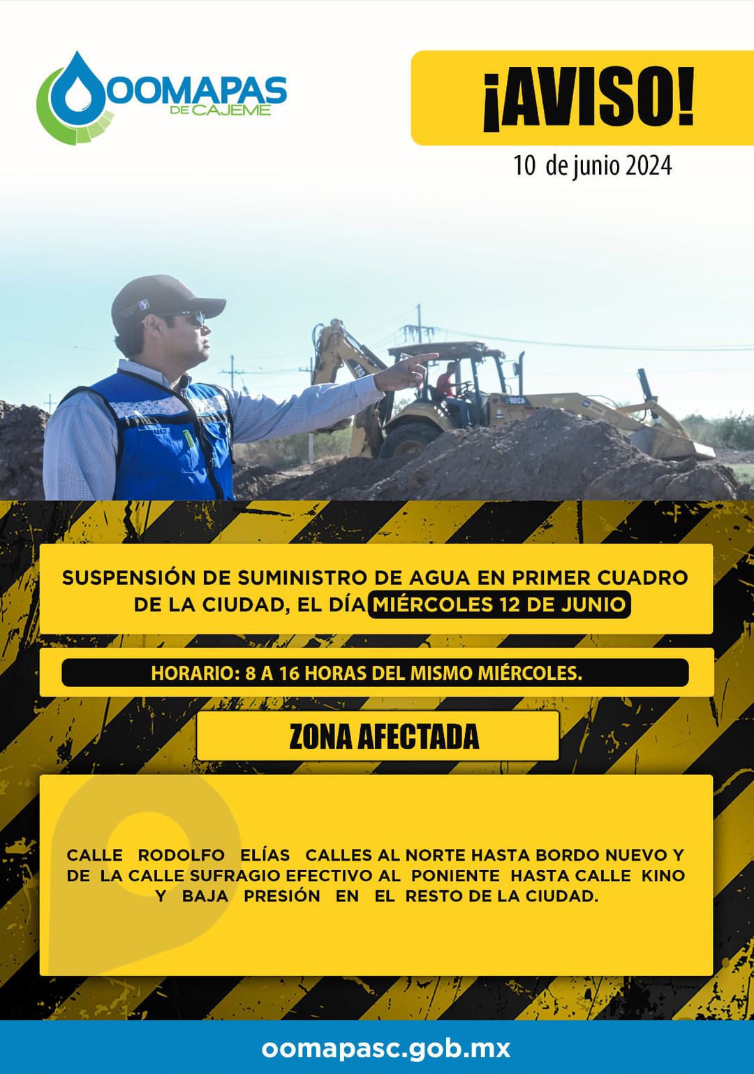 Se suspenderá totalmente el servicio de agua potable en el primer cuadro de Ciudad Obregón que comprende de las calles: