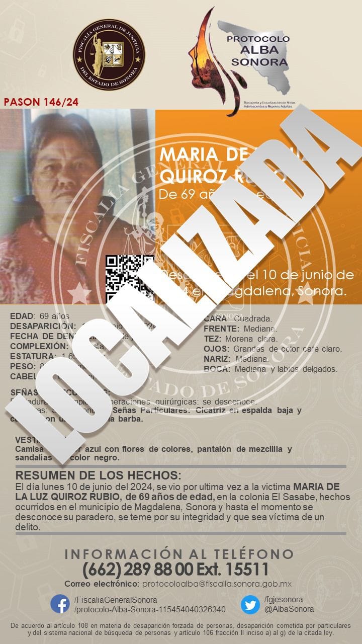 Se agradece su valiosa colaboración en difusión de la presente cédula a nombre de MARÍA DE LA LUZ QUIRÓZ RUBIO de 69 años de edad. afortunadamente localizada con vida, misma que salió de su vivienda por cuenta propia y que era buscada por elementos de la AMIC desde el pasado 10 de junio.