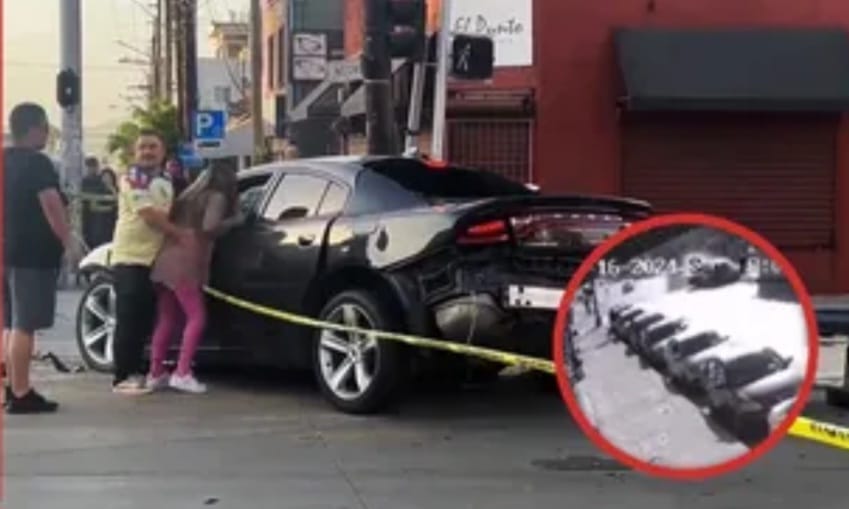 El incidente fue grabado por cámaras de videovigilancia. En las imágenes se puede observar el fuerte impacto entre un Dodge Charger con placas de California y un auto Nissan Sentra.
