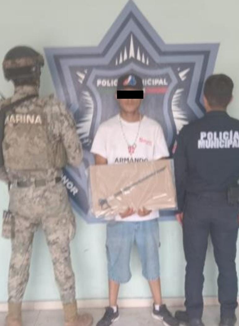 A través de recorridos para la inhibición y prevención de los delitos, oficiales de la SSPM en coordinación con Marina, llevaron a cabo la detención de dos hombres, por el presunto delito de portación de arma prohibida.