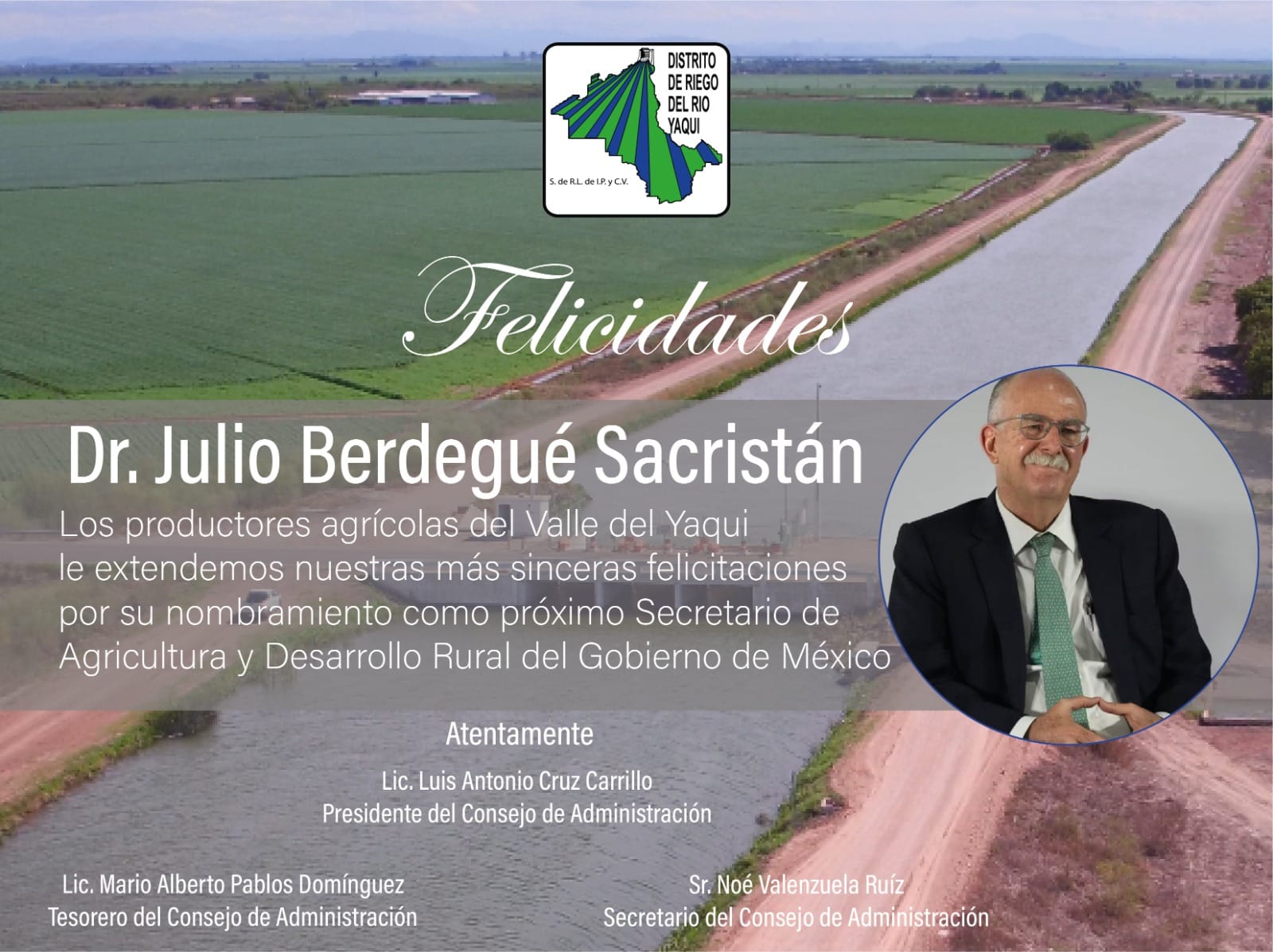 EL DISTRITO DE RIEGO DEL RÍO YAQUI @drryaqui FELICITA AL DOCTOR JULIO BERDEGUÉ SACRISTÁN POR SU NOMBRAMIENTO COMO PRÓXIMO SECRETARIO DE AGRICULTA EN EL GABINETE DE CLAUDIA SHEINBAUM, PRESIDENTA ELECTA DE MÉXICO