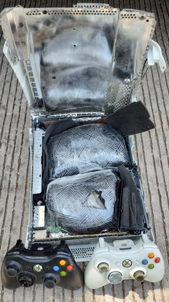 Para corroborar, llevaron a cabo un segundo rastreo con otro binomio canino, obteniendo una indicación similar; por tal motivo, los integrantes de la Guardia Nacional inspeccionaron la caja y localizaron una consola de videojuegos que ocultaba en su interior dos envoltorios con aparente droga sintética cristal.