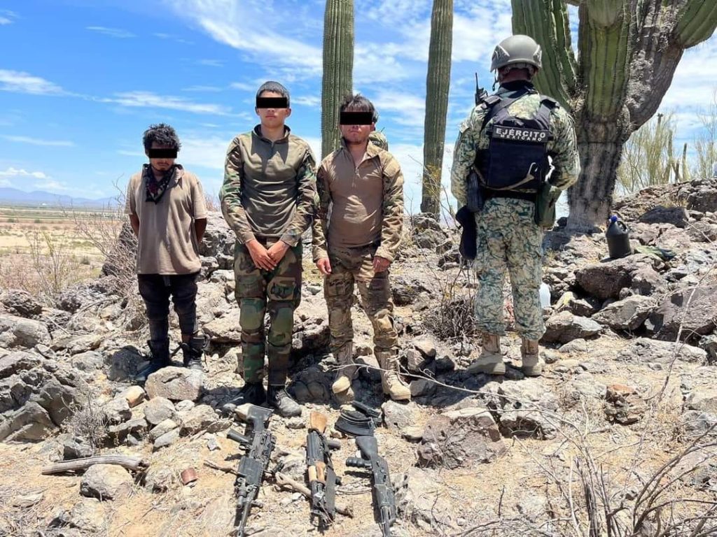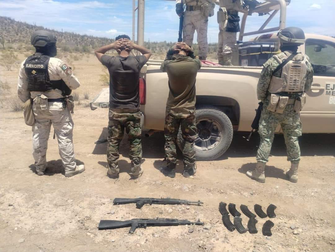 Mientras que, en otro recorrido, en el kilómetro 088+900 de la carretera Altar-Caborca, fueron arrestados Martín “N”, Benito “N”, Fidel “N”, y Oscar “N”, en posesión de cuatro armas de fuego tipo fusil, 10 cargadores y 284 cartuchos calibre 7.62×39 mm, además de la camioneta en la que se accidentaron.