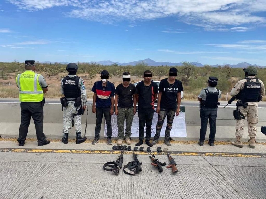 En las inmediaciones de la carretera de Camino Viejo al Desemboque, en el municipio de Caborca, fueron detenidos Gustavo Ángel “N”, José Manuel “N”, Ricardo Misael “N”, Jesús “N”, y Jonathan “N”, quienes traían consigo cinco armas de fuego tipo fusil, 13 cargadores y 258 cartuchos de diversos calibres de uso militar.
