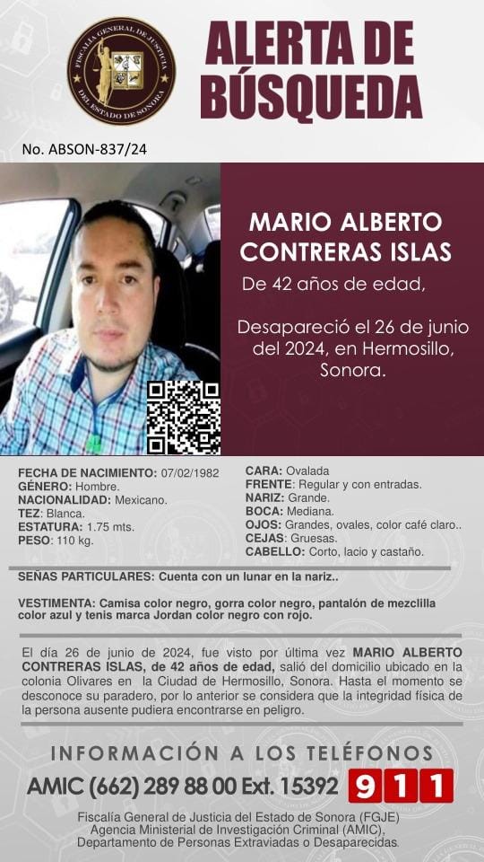 Se solicita a la ciudadanía su colaboración en la difusión de Alerta de Búsqueda para pronta localización de MARIO ALBERTO CONTRERAS ISLAS, de 42 años de edad. Desapareció el 26 de junio de 2024, en Hermosillo, Sonora.