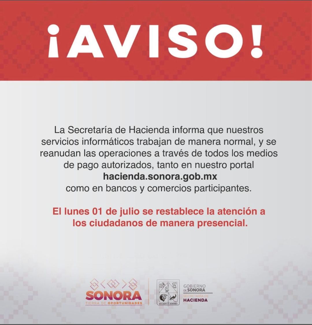 Hermosillo. La Secretaría de Hacienda ha anunciado que sus sistemas informáticos han sido completamente restablecidos y están operando con normalidad y sin registro de fallas en la información. Como resultado, todos los servicios de la Secretaría están funcionando adecuadamente, tanto en el portal hacienda.sonora.gob.mx como en bancos y comercios participantes.