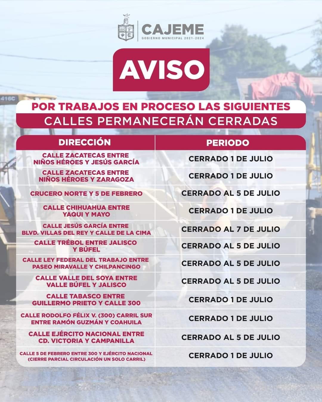 Por trabajos de rehabilitación, las siguientes calles permanecerán cerradas.