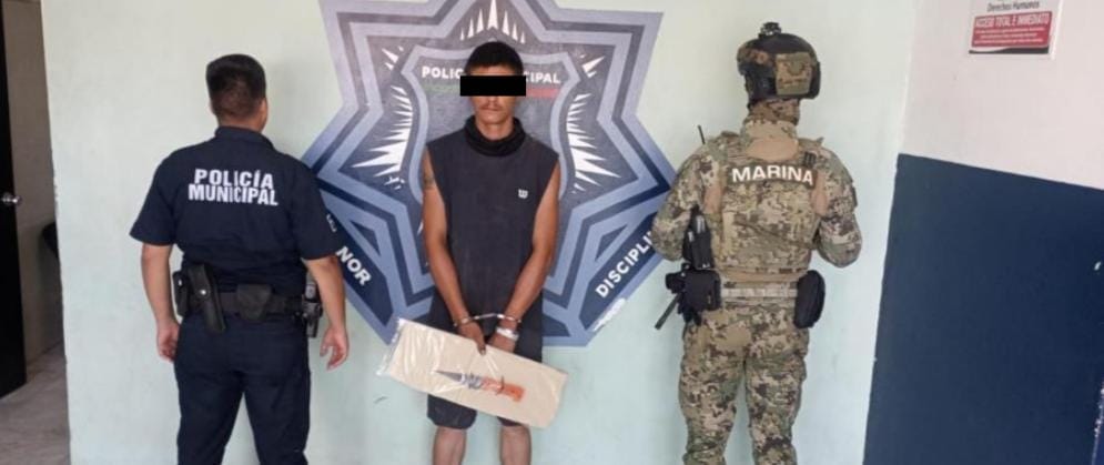 Una vez atendido el llamado de emergencia agentes de la Policía Municipal y Marina, detuvieron a Rubén Eduardo “N.”, de 22 años de edad, a quien se le aseguró un arma prohibida tipo cuchillo.