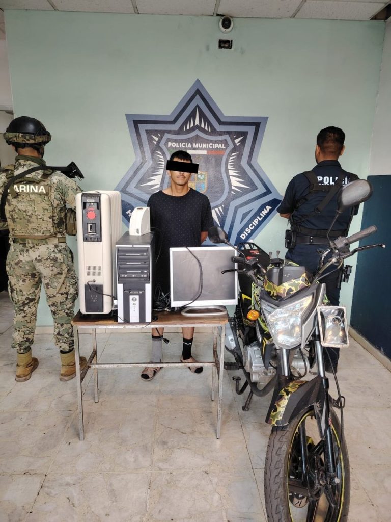 Acudiendo de inmediato al sitio reportado por la calle Mayo entre Campeche y California en la colonia Chapultepec, donde detectaron al presunto identificado como Carlos Alfredo “N.”, de 30 años, en el interior de la vivienda afectada, este último al darse cuenta del arribo de las unidades policiacas intentó huir, sin embargo, fue capturado rápidamente, logrando recuperar un CPU de la marca LG, un monitor, un regulador, un calentón y una motocicleta de la marca Italika de color gris con amarillo, objetos que presuntamente había intentado sustraer de forma ilegal minutos atrás.