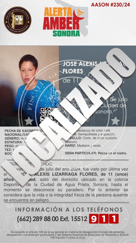 SE DESACTIVA ALERTA AMBER SONORA, SE LOCALIZÓ SANO y SALVO
