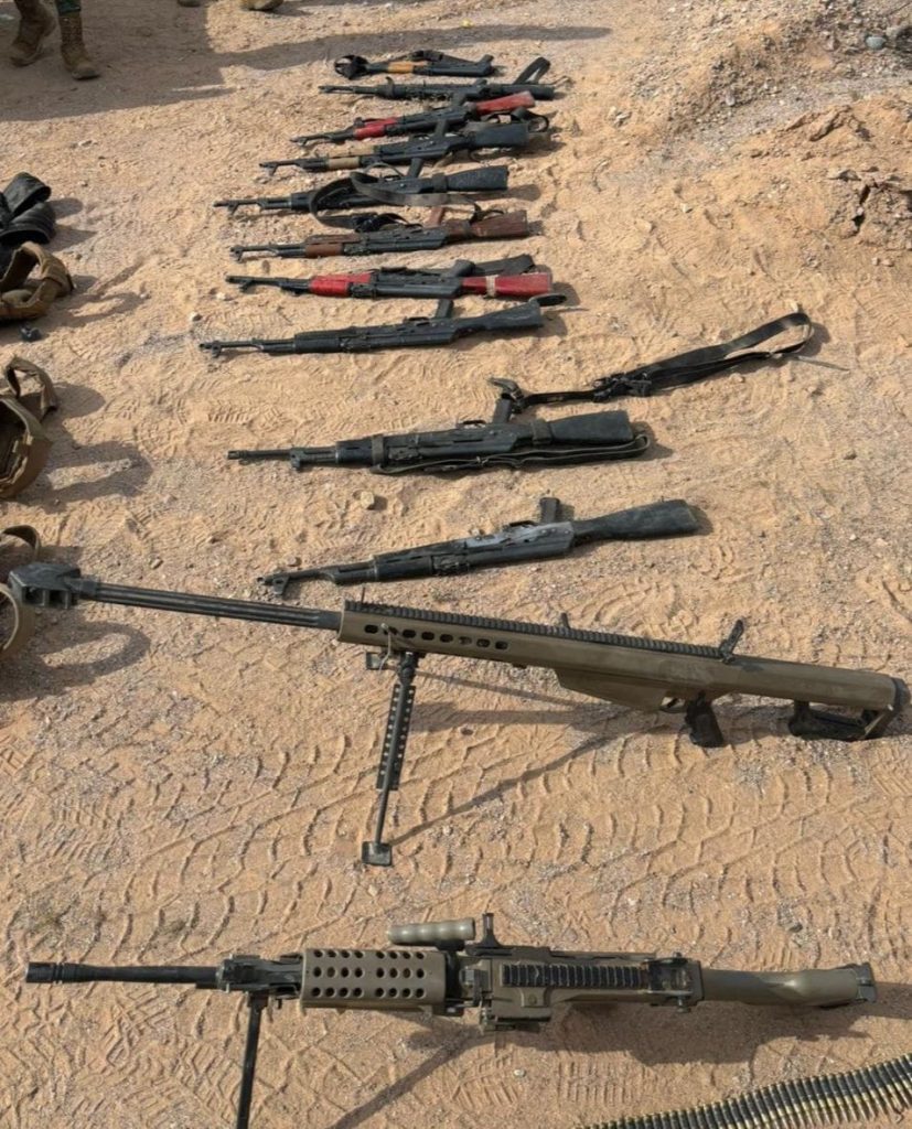En el lugar se aseguraron 12 armas largas, una de ellas una ametralladora semiautomática modelo M249S calibre 5.56 mm; y una tipo Barret calibre .50mm; así como 10 fusiles tipo 7.62 x 39 mm.