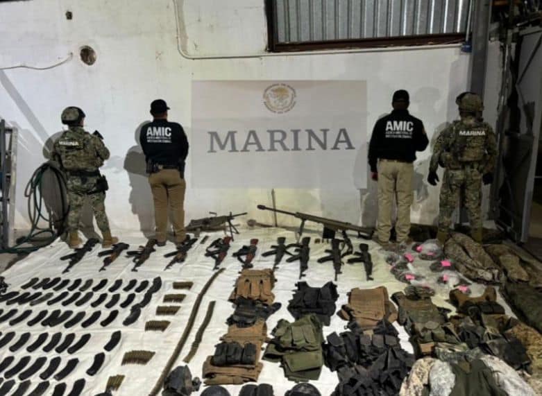 Hermosillo.- Al realizar recorridos terrestres de seguridad en operativo coordinado la Secretaría de Marina (SEMAR) y de la Agencia Ministerial de Investigación Criminal (AMIC), se llevó el aseguramiento de un arsenal de armas de fuego, cartuchos, cargadores,