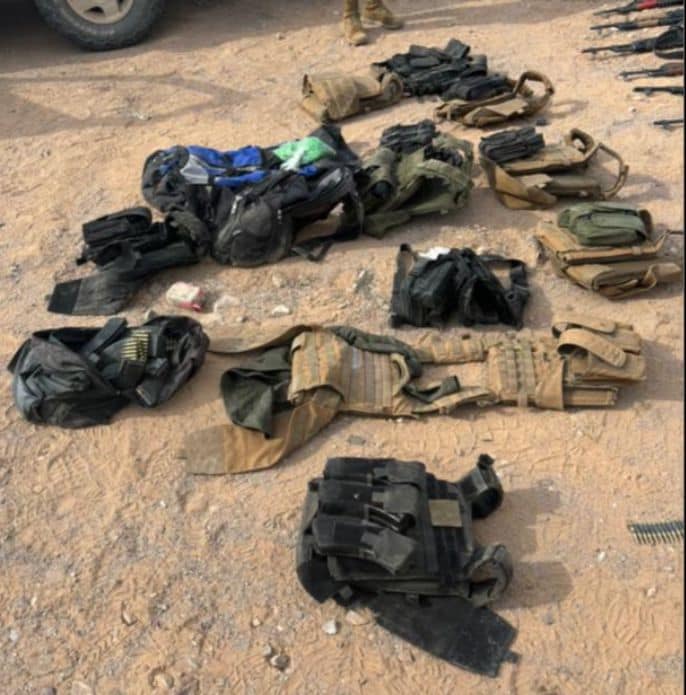 También se aseguraron dos vehículos, uno de ellos tipo pick up y una camioneta, ambos con reporte de robo; 69 cargadores de diferentes calibres, mil 861 cartuchos calibre 7.62 x 39 mm, 10 chalecos balísticos, tres percheras, dos cascos tácticos, ocho poncha llantas, cuatro mochilas tácticas, 56 cartuchos calibre .50, 265 cartuchos calibre 5.56, 20 camisolas y 23 pantalones tipo tácticos y una piernera tipo táctica.