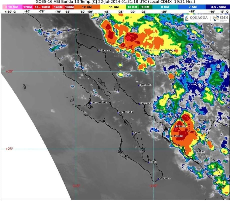 Algunas tormentas se han generado a lo largo del estado de Arizona y se desplazan hacia el interior de Sonora. Se prevé que en las próximas horas pudieran generar precipitaciones de moderadas a fuertes en el sector norte de la entidad. Así mismo, se esperan rachas de viento por encima de los 60 km/h y descargas eléctricas, así como la posibilidad de caída de granizo. Atención para los municipios de Nogales, Santa Cruz, Ímuris, Naco, Agua Prieta, Cananea, Nacozari, Altar, Sáric, Tubutama, Magdalena de Kino y comunidades vecinas.